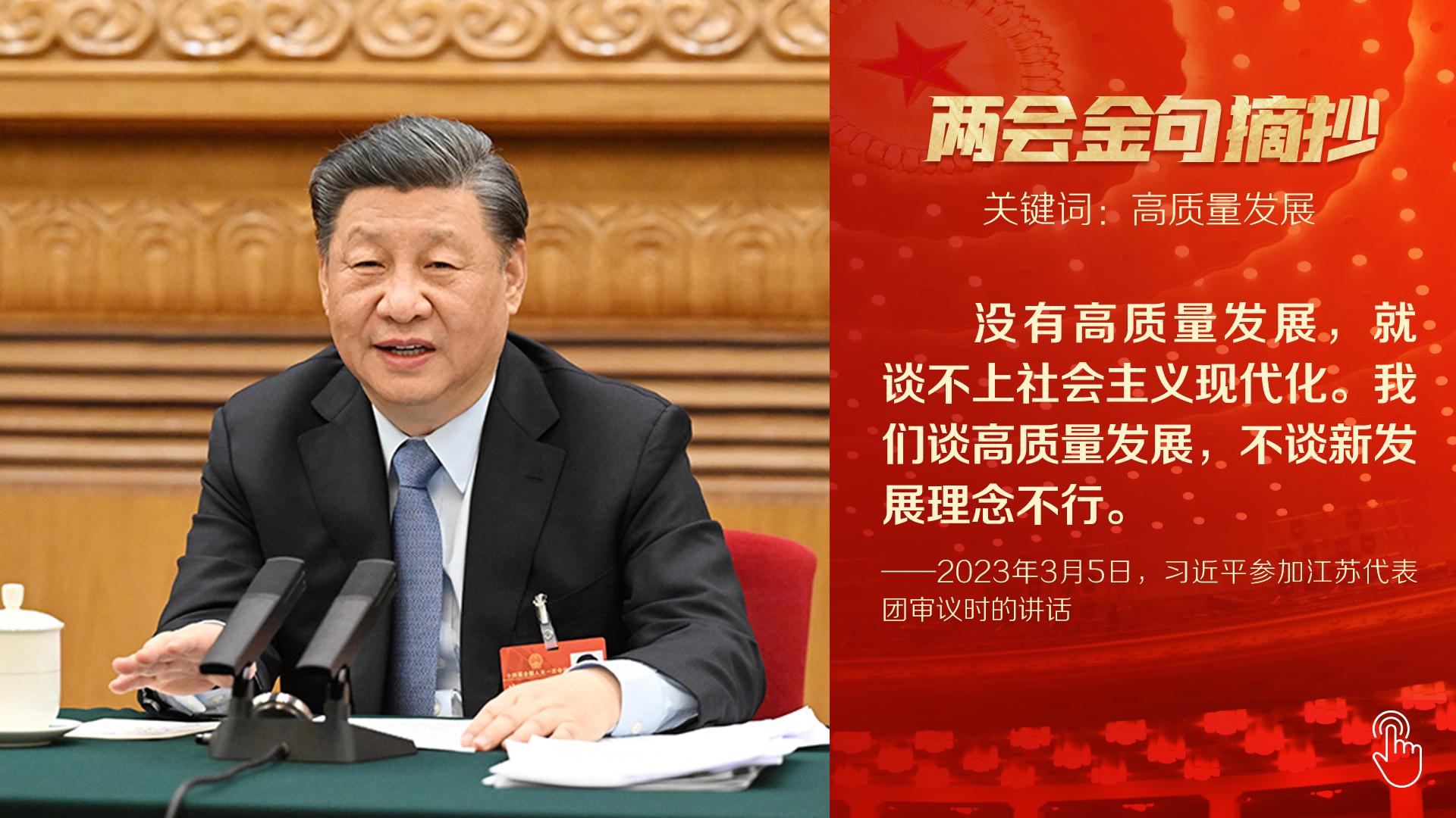“高質量發展是全面建設社會主義現代化國家的首要任務。”今年兩會首次到團組,總書記以高質量發展為題,詳細闡述中國未來施政發力點。第二天參加民建、工商聯界委員聯組會,他又就正確引導民營經濟健康發展、高質量發展作出重要論述,一句“要堅守主業、做強實業,自覺走高質量發展路子”為全國4700多萬家民營企業指明方向。十四屆全國人大一次會議閉幕會上,總書記再次向世界宣示:在強國建設、民族復興的新征程,我們要堅定不移推動高質量發展。