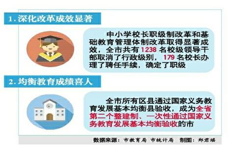 隨著改革深入推進,全市教育工作呈現出前所未有的生機與活力。城區26所學校、全市60多所學校開展了聯合辦學,撤并了11所規模小、條件差、效益低的農村高中;累計投入約6億元,大力改善普通高中學校辦學條件,按照省定基本辦學條件標準,新建、改擴建6所高中學校;在全國中學生五大學科奧賽以及科技創新大賽、英語能力競賽、電腦作品大賽中有800多人次獲獎,全市高考錄取率和錄取人數一直在全省名列前茅;中小學校長職級制改革和基礎教育管理體制改革取得顯著成效,全市共有1238名校級領導干部取消了行政級別,179名校長辦理了聘任手續,確定了職級;省內外10余個地市前來學習考察改革經驗,市教育局入選全國地市教育改革創新共同體。