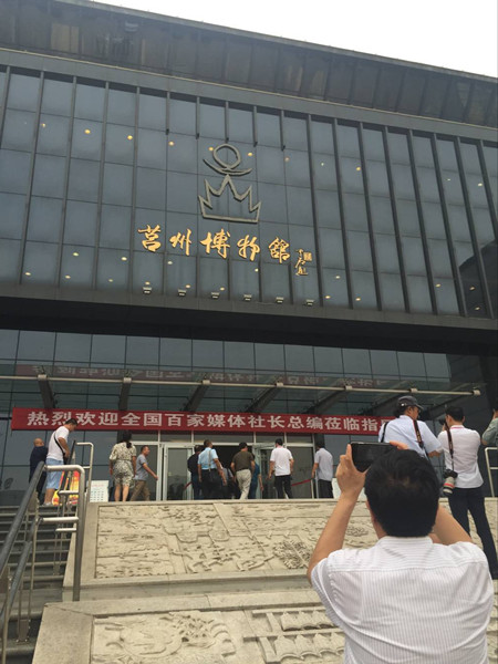 25日下午,采訪團(tuán)抵達(dá)莒州博物館,莒州博物館的石刻吸引了眾多采風(fēng)團(tuán)成員的眼球。據(jù)悉,8月24日至27日,日照市召開中國(guó)絲綢之路經(jīng)濟(jì)帶城市報(bào)業(yè)聯(lián)盟成立大會(huì)暨黨報(bào)跨界融合創(chuàng)新發(fā)展年會(huì),同時(shí)開展百家媒體社長(zhǎng)總編看魅力日照采風(fēng)活動(dòng)。(記者 秦釗 曹鈺迪 攝)