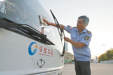 “要不是在公交公司,我可能一輩子都開不上這么高級的車呢。”李建華邊檢查邊說。