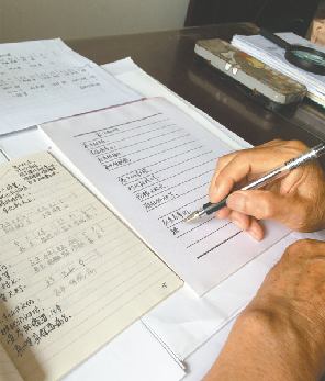 7月10日上午,記者來到了安郁運所居住的正陽社區,當時他正坐在書房的書桌前,忙著整理收集來的抗戰歌謠,將隨身攜帶的小本子上收集來的歌謠謄抄到專用紙上。