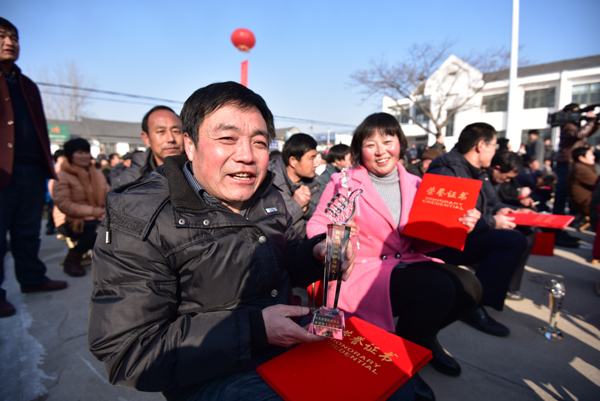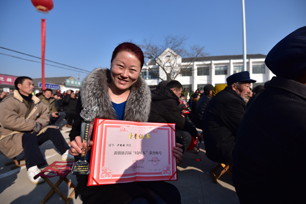 2月2日,兩位首屆黃墩鎮身邊好人獲得者展示自己的證書和獎杯。當日,嵐山區黃墩鎮舉行首屆道德模范暨身邊好人頒獎慶典,對8名黃墩鎮道德模范和69名身邊好人進行了表彰,并現場介紹了他們的感人事跡。這些來自黃墩鎮的基層典型,帶頭踐行社會主義核心價值觀,弘揚中華傳統美德,將榜樣的力量在群眾中傳遞。