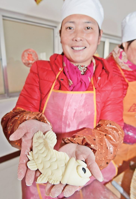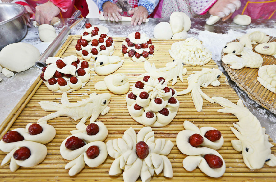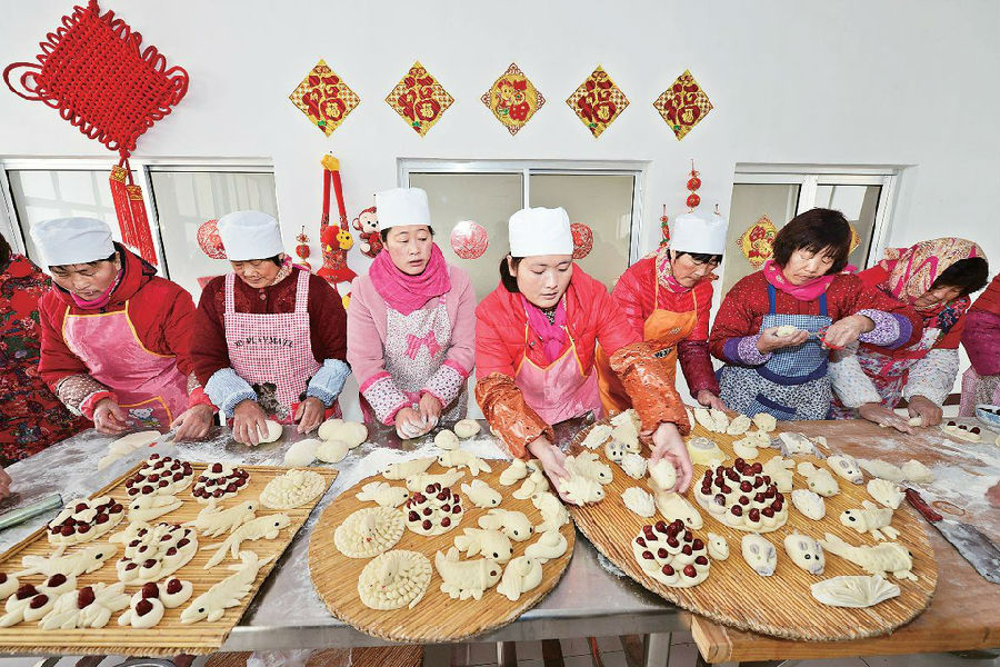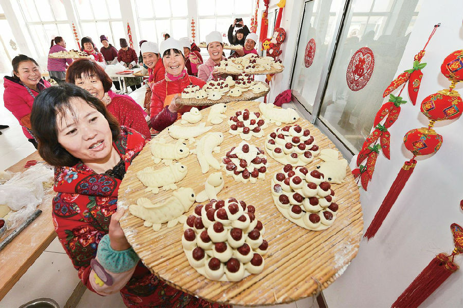 1月30日,莒縣浮來山鎮田家店子村老年公寓,20多位村民在老年公寓食堂制作花饃。 浮來山鎮田家店子村有春節蒸花饃的習俗,每年春節前,村民們都會聚集在一起蒸花饃,為即將到來的新春佳節增添濃濃年味?;x可以用來敬神祭祖或當作走親訪友的饋贈禮品。春節前,田家店子村村委會給100多戶70歲以上的老人送上一份花饃年禮,祝福老人健康長壽。 ?。ㄓ浾?陳為峰 攝)
