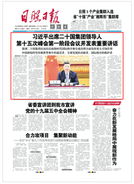新華社北京11月21日電 國家主席習近平21日晚在北京以視頻方式出席二十國集團領導人第十五次峰會第一階段會議并發表題為《勠力戰疫共創未來》的重要講話,強調二十國集團應該遵循共商共建共享原則,堅持多邊主義、開放包容、互利合作、與時俱進,在后疫情時代國際秩序和全球治理方面發揮更大引領作用。中國愿同各國相互尊重、平等互利、和平共處、共同發展,共同推動構建人類命運共同體。