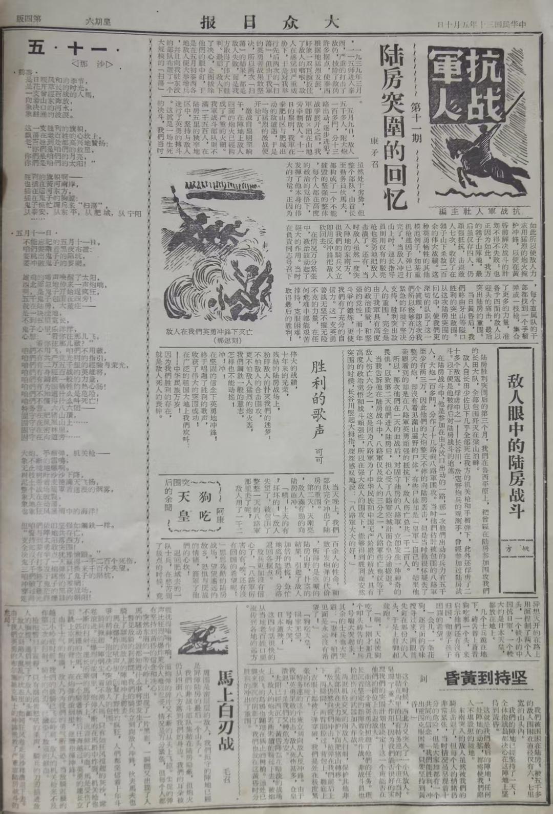 1941年5月10日,陸房突圍戰(zhàn)斗即將兩周年之際,《大眾日報》又于第四版刊發(fā)了陸房突圍戰(zhàn)斗的相關(guān)內(nèi)容。此次,報紙用了一個整版來呈現(xiàn)陸房突圍相關(guān)情況,不僅刊有詳細記錄陸房突圍過程的《陸房突圍的回憶》《馬上白刃戰(zhàn)》《堅持到黃昏》等文章,還刊有從被俘日軍視角看待陸房突圍戰(zhàn)斗的《敵人眼中的陸房戰(zhàn)斗》、突圍后的余聞《狗吃天皇》,以及兩篇歌頌陸房突圍勝利的詩歌《勝利的歌聲》《五·十一》。此外,版面還配有一張木版畫《敵人在我們英勇沖鋒下滅亡》。