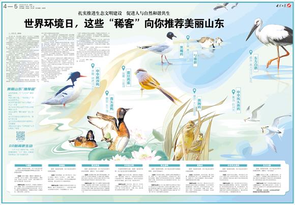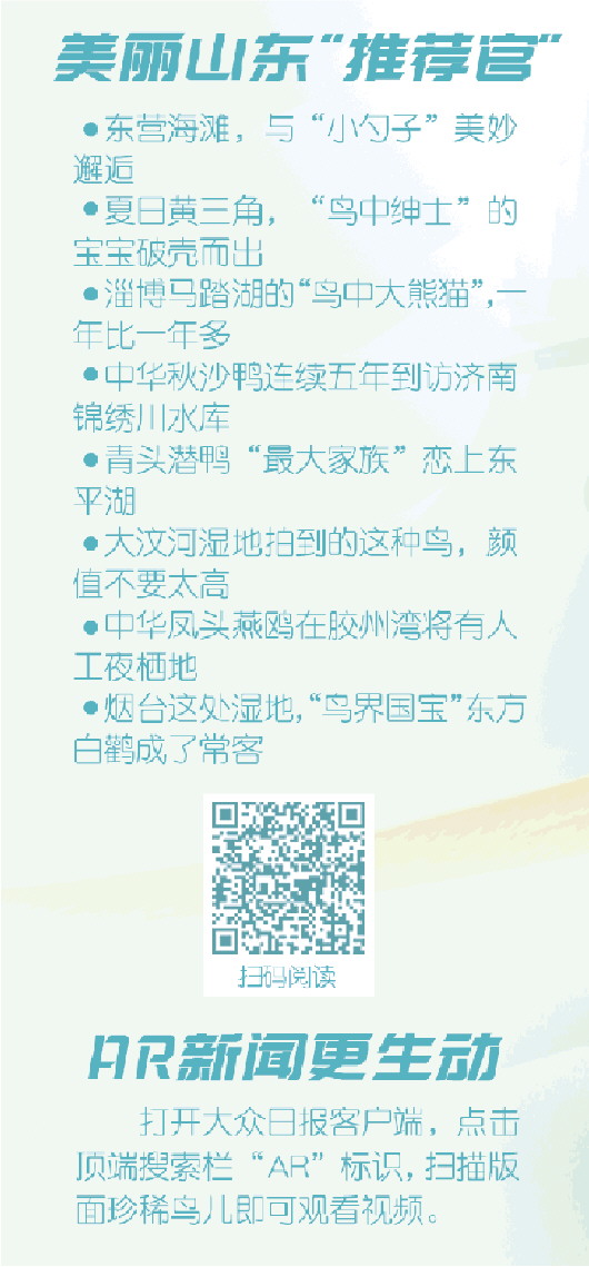 如今在山東,人鳥共繪四時(shí)美景:春天青頭潛鴨在東平湖等你相會,夏日有中華鳳頭燕鷗在膠州灣向你發(fā)出邀約,秋季黃河入海口飛過漫天的鳥浪,冬季正是到榮成看天鵝的大好時(shí)節(jié)。與自然為鄰,與鳥兒為伴,齊魯大地上,每個(gè)人都是自然的守護(hù)者,共同點(diǎn)亮人與自然和諧共生的美好未來。