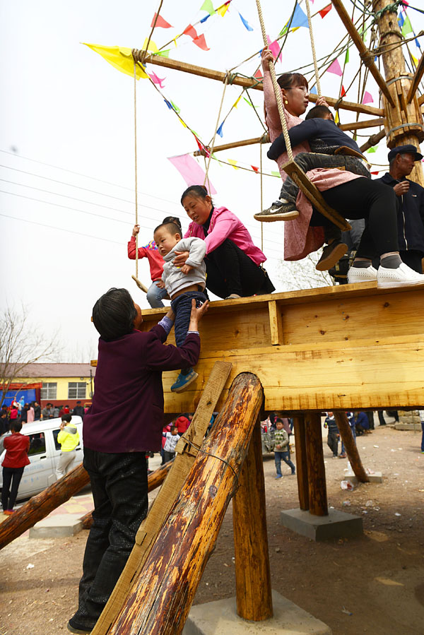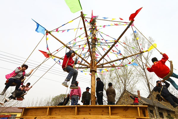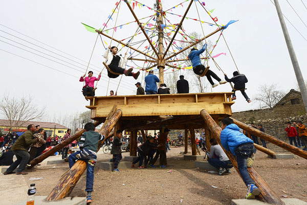 4月4日,莒縣碁山鎮(zhèn)西山旺村,村民和回家過清明節(jié)的親朋好友一起來過秋千節(jié),以“轉(zhuǎn)悠千”的方式,共同慶祝清明節(jié)。