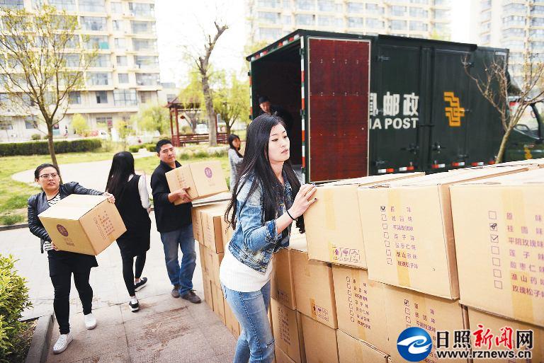 4月27日,一輛承載著1000公斤阿膠糕的郵政廂貨車抵達日照市太陽海岸小區,這是從事微商的劉飛這個月預定的第四批貨。
