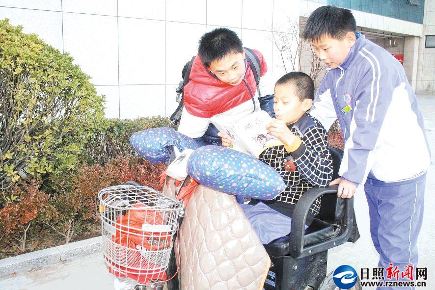 趙峰同學(xué)經(jīng)常把自己心愛的學(xué)習(xí)用品送給劉凱旋。王豪主動(dòng)和劉凱旋結(jié)成助學(xué)對子,開展學(xué)習(xí)競賽。于鎮(zhèn)源、萬金輝等同學(xué)每天放學(xué)都主動(dòng)幫劉凱旋把輪椅車從樓道存放處推出,幫著拿書包,陪伴他一同回家、一起上學(xué)。