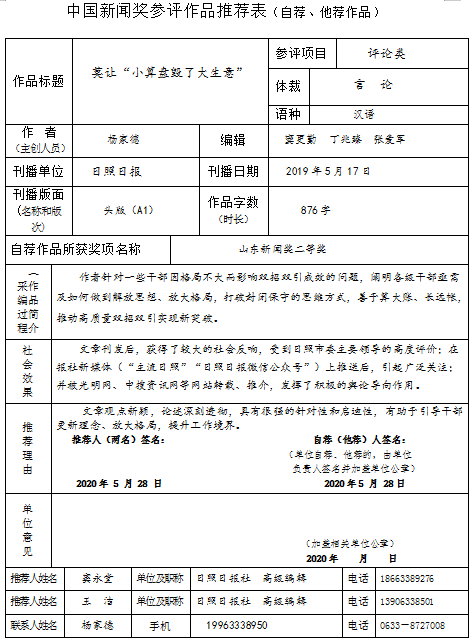 經上級主管單位批準,個人自薦《莫讓“小算盤毀了大生意”》(刊發于2019年5月17日《日照日報》頭版)參加第三十屆中國新聞獎評論類作品評選,現對作品參評材料進行公示,接受公眾監督,公示期6月2日至8日。