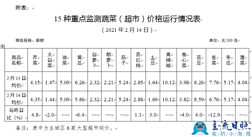 市民比較關注的大白菜(每500克,下同)今日均價1.44元,比昨天下降2.0%;雞蛋(普通)、青辣椒今日均價4.38元、10.12元,與昨日持平;大蔥今日均價為8.39元,比昨日上升5.0%。