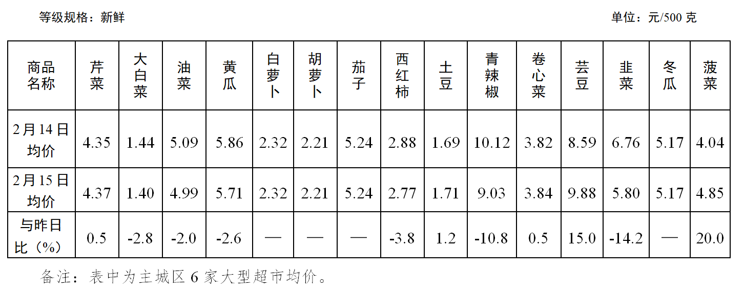 15種重點(diǎn)監(jiān)測(cè)蔬菜(超市)價(jià)格運(yùn)行情況表