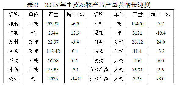 農業生產保持穩定。全年實現農林牧漁業總產值256.29億元,按可比價格計算,比上年增長4.3%;實現增加值147.39億元,增長4.3%。受嚴重旱情影響,全年糧食作物種植面積233.95萬畝,總產量93.22萬噸,單產398.45公斤/畝,比上年分別下降4.1%、6.9%、3.0%。全年肉類產量26.12萬噸,增長24.0%;奶類產量2.6萬噸,增長6.0%;蛋類產量11.4萬噸,下降3.2%。水產品總產量59.56萬噸,增長2.0%。