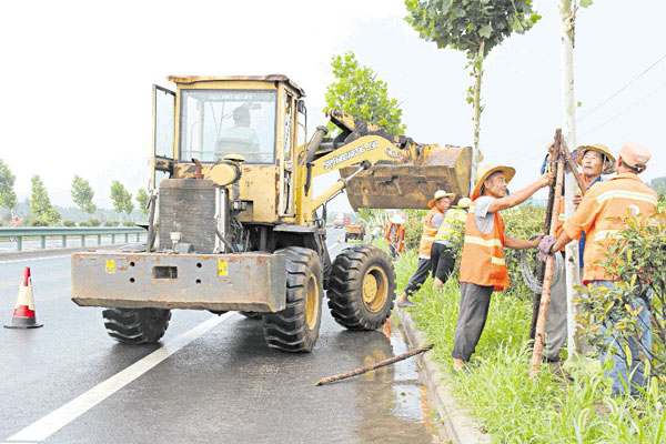 連日來,臺風“安比”給我市國省道公路管養帶來較大影響:出現路肩行道樹倒伏、邊坡塌方、路面坑槽嚴重等情況。市公路局本著“不漏掉每條道路、不放過每個細節”的原則立即展開道路隱患排查,迅速組織養護工作人員,全面修整公路基礎設施,確保公路交通暢通無阻和市民出行安全。① 對222省道兩側行道樹扶正培植② 對204國道丹陽路路段坑槽進行修補③ 修復613省道水毀路段(本報通訊員 張守軍 文楊偉超 攝)