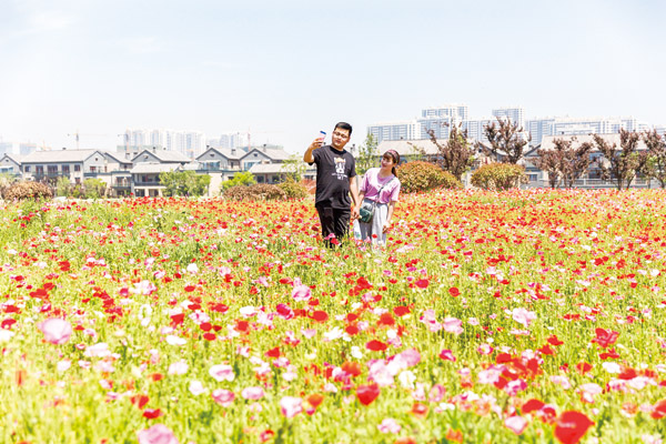 6月1日,東夷小鎮周邊的花海景區百花競相綻放,吸引了眾多游客觀賞、游玩。