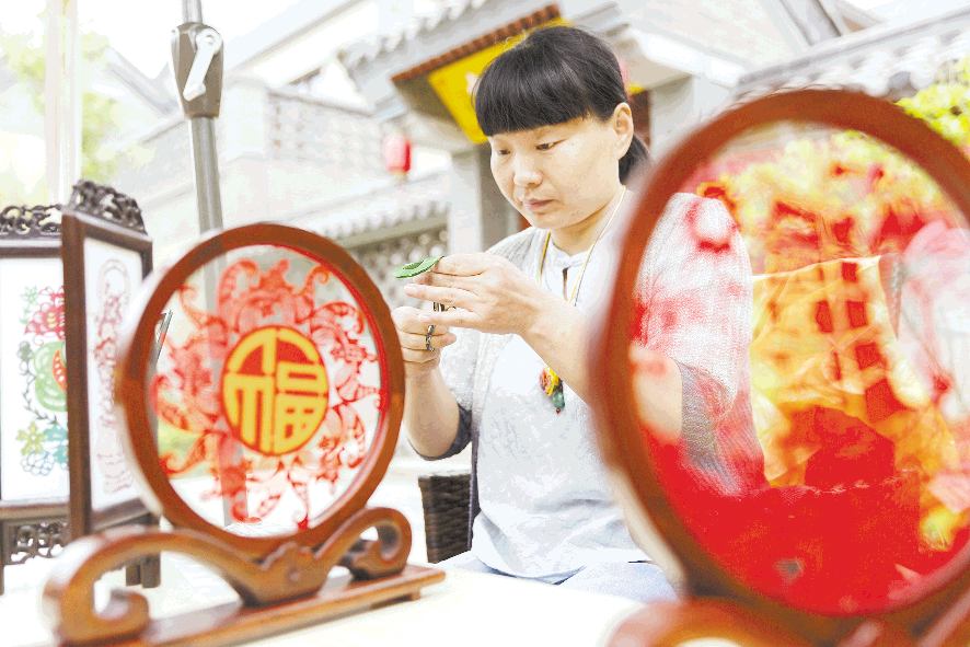 6月9日,在山東日照東夷小鎮(zhèn)舉行的2018山東省日照市非物質(zhì)文化遺產(chǎn)博覽會上,民間藝人在展示剪紙技藝。 當(dāng)日是2018年文化和自然遺產(chǎn)日,各地舉行豐富多彩的文化遺產(chǎn)展示、展演活動。