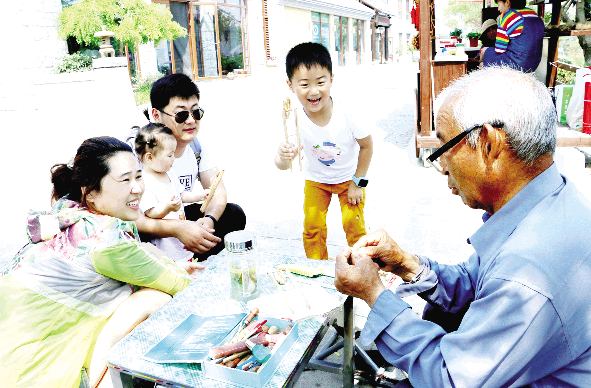 6月13日上午,游客被東夷小鎮內的一位雕刻藝人做的手工玩具吸引。 作為我市新舊動能轉換的新引擎和旅游發展的新名片,目前,東夷小鎮已完成選商,其中美食業態有102家、手工文創及非遺產品13家。 民俗、旅游、產業的相互交融,給游客帶來全新的旅游休閑體驗,滿足了游客“吃住行游購娛”的綜合體驗游需求。景區自試運營以來,已累計客流100余萬人次。 (本報記者 曹鈺迪 攝)