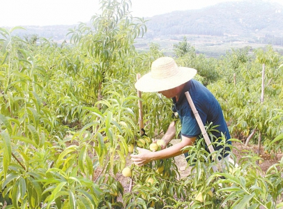 7月18日,嵐山區中樓鎮雞山溝村黃桃種植片區,村民正在進行黃桃管理。目前,該村已種植黃桃100余畝,年產量約15萬公斤,村集體年增收7萬余元。