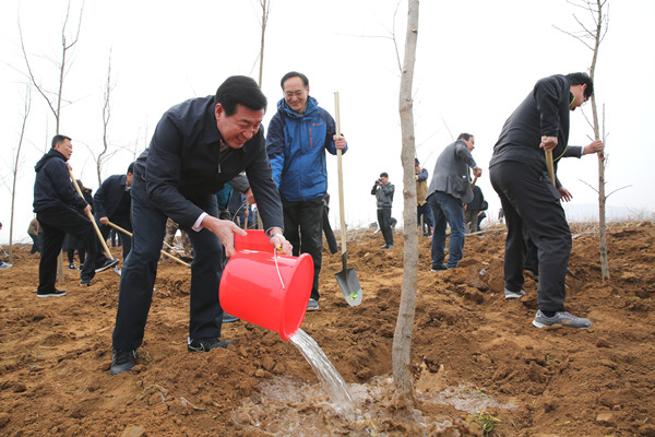 3月12日, 在日照水庫流域生態建設現場,市委書記、市人大常委會主任楊軍(左一)在植樹。