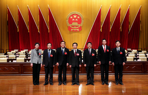日照市市長、副市長合影。左起:林彥芹(女)、高月波、徐淑利、齊家濱、劉兆亮、李峰、張培林。(本報記者 李青 攝)