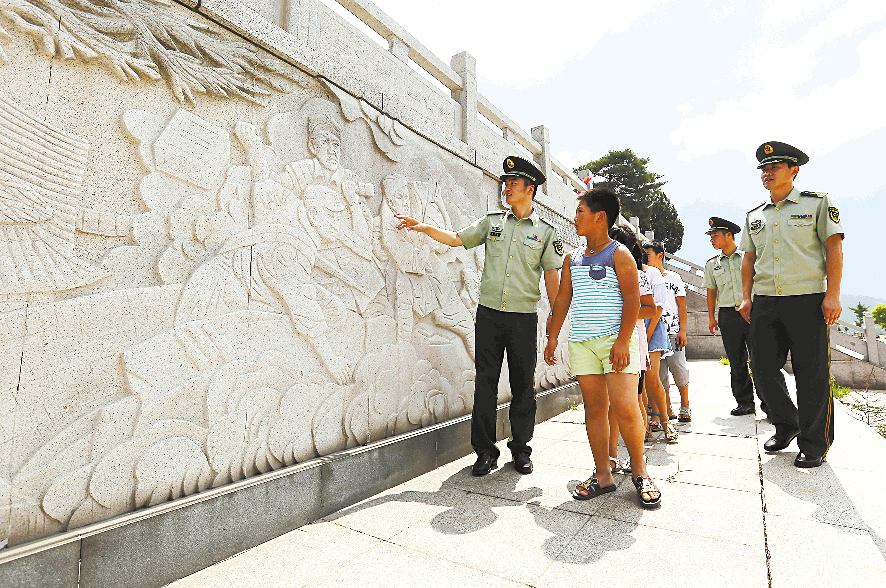 8月12日,武警官兵在為學生們講解抗戰故事。