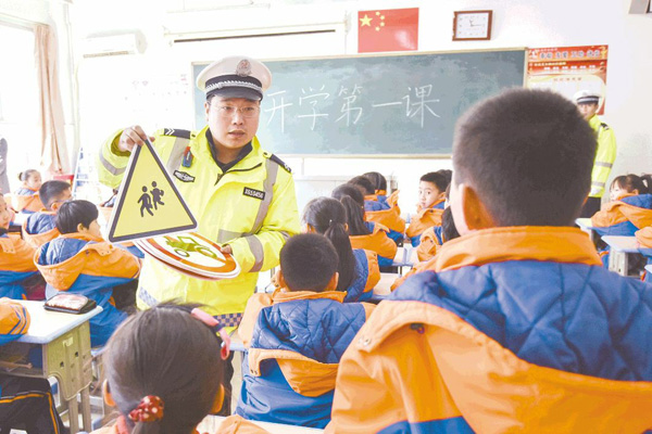 3月5日,日照交警直屬大隊的交警為濟南路小學學生講解交通標志牌。 當日是日照市中小學開學的第一天。日照交警直屬大隊組織交警進入轄區(qū)各中小學校,開展“開學第一課,交通安全進課堂”宣傳教育活動。交警通過向學生講解交通安全知識、識別交通標志牌等,為學生上好開學第一堂交通安全課,以提高學生們的交通安全意識和自我保護能力。 (本報記者 路杰 攝)