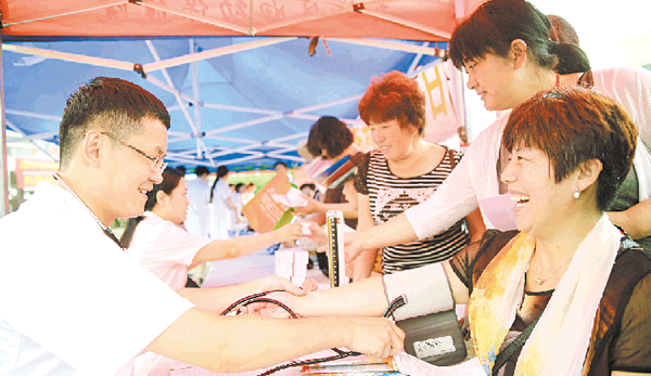 7月11日,計生服務人員在為社區居民進行健康檢查。 當日,日照市暨東港區2018年世界人口日宣傳活動在秦樓街道城市花園社區舉行,通過免費義診、發放藥具、提供計生政策咨詢等方式,向群眾普及健康知識,倡導科學、進步、文明的婚育觀念。 今年7月11日是第29個世界人口日,活動宣傳主題為“共建生育文明,共享美好生活”。(本報記者 李大偉 通訊員 于常亮 攝)