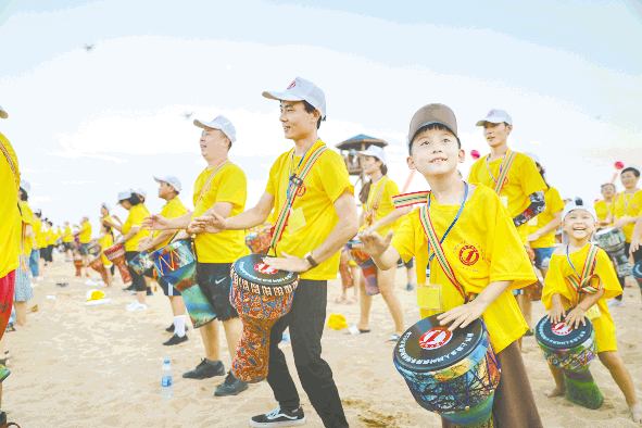 8月22日下午,2018名非洲鼓鼓手正在同時演奏非洲鼓,山海天旅游度假區陽光海岸露營公園鼓聲喧天,聲勢浩大。