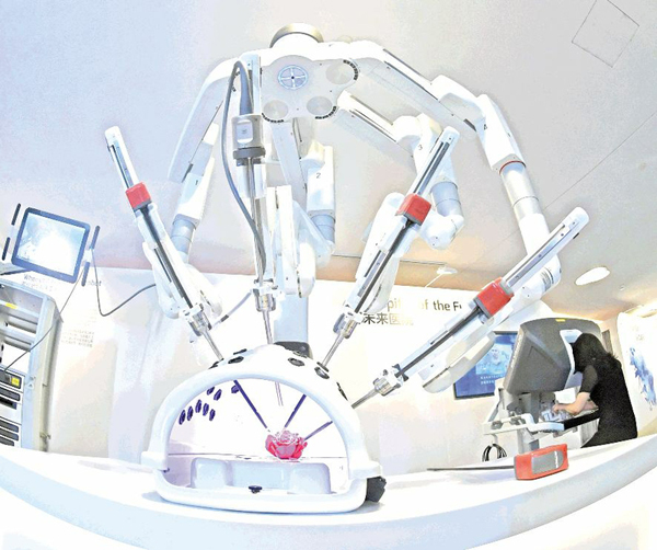 7月1日,在大連國際會議中心,參會嘉賓用手術機器人體驗手術模擬操作。 世界經濟論壇第十三屆新領軍者年會(夏季達沃斯論壇)7月1日至3日在遼寧大連舉行。會場上手術機器人、5G智能沙箱、生物識別技術等科技感十足的展示項目吸引了眾多與會者參觀體驗。(新華社發)