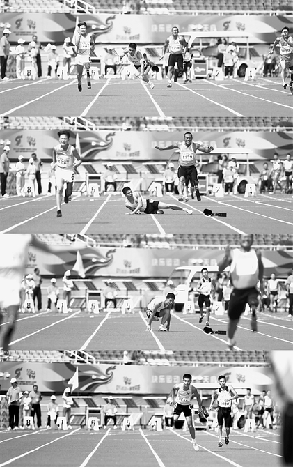 9月13日,全國第九屆殘疾人運動會暨第六屆特殊奧林匹克運動會田徑比賽在成都市體育中心拉開戰(zhàn)幕,在男子T42級100米決賽中,該項目全國紀(jì)錄保持者、山東選手李茂大在鳴槍出發(fā)后義肢意外脫落并摔倒,隨后迅速爬起,手持義肢堅持完成了比賽。 圖為位于第五道的李茂大從跌倒到爬起繼續(xù)比賽的全過程瞬間。(新華社記者 夏一方 攝)