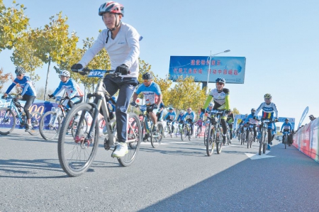 10月31日上午,參加自行車比賽的選手在進行激烈角逐。 當日,由東港區委宣傳部、東港區文體新局等主辦的2015東港區全民健身運動會暨第三屆自行車挑戰賽拉開帷幕,來自全省17地市800余名“騎行俠”參加了比賽。選手們從山海西路日照街道段出發,全程騎行至終點三莊鎮龍門崮風景區,全長35公里。 (記者 潘一凱 攝)