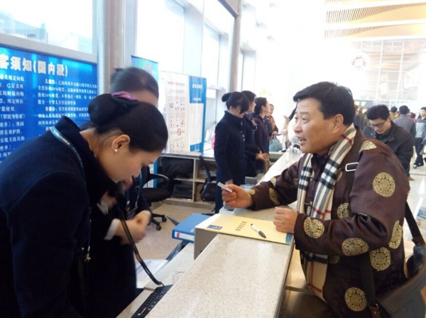 乘客高興泉在問訊臺詢問如何換取登機牌,他將乘坐下午1點45的航班飛往大連。他評價日照機場說,非常舒適。(日照日報社全媒體報道 王帥攝)