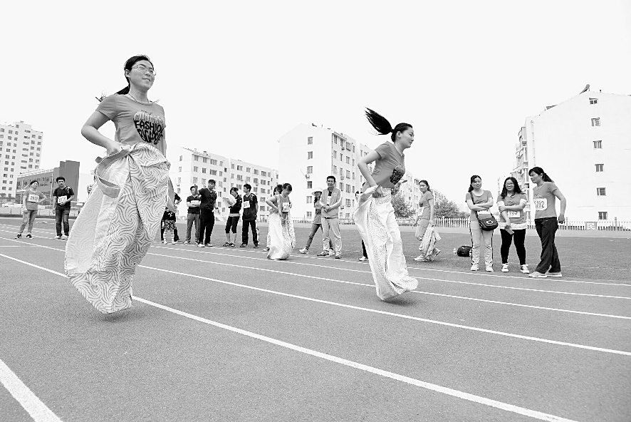5月23日,秦樓街道社區居民在比賽袋鼠跳。當日,東港區秦樓街道第二屆城市社區趣味運動會在濟南路小學拉開帷幕,來自街道12個社區的150余名社區居民參加了投籃、呼啦圈、拔河等10余個趣味運動項目。秦樓街道“健康金鑰匙”服務也于當日啟動,將在各社區開展身體、心理、社交、道德健康方面的健康服務活動,提升社區居民健康質量和幸福指數。(記者 路杰 攝)