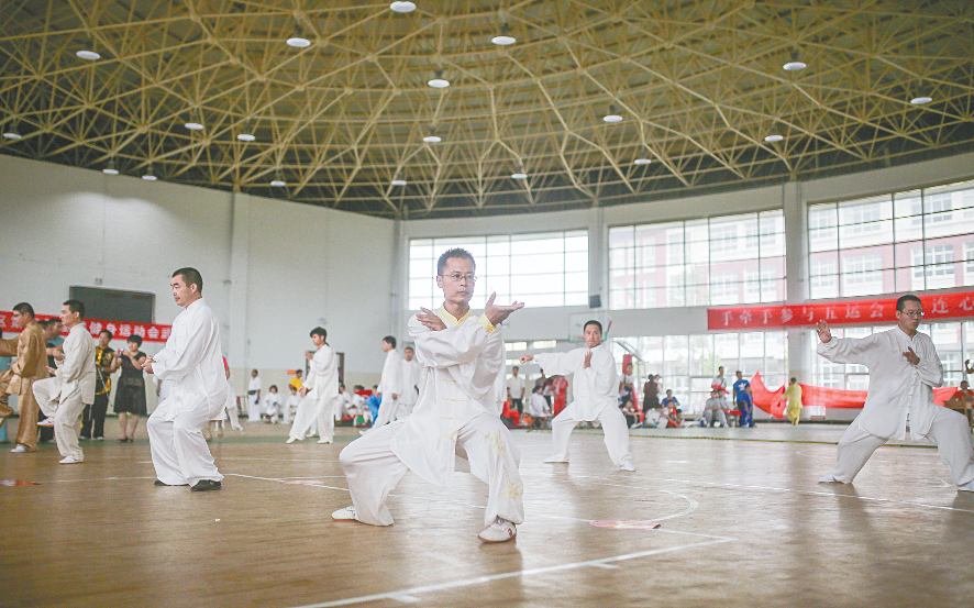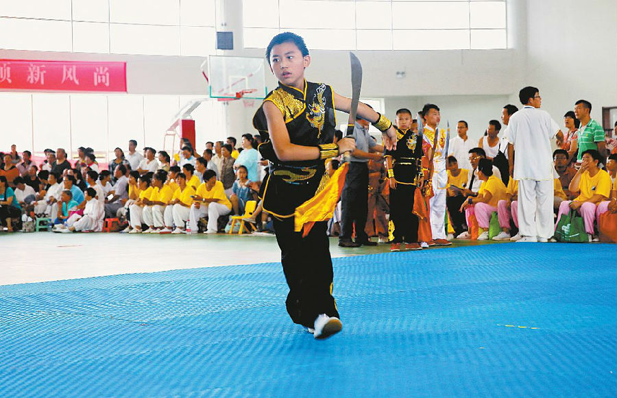 8月8日,運動員正在進行武術比賽。當日,2015年日照市第五屆全民健身運動會 武術比賽暨第八屆武術大會在日照東港實驗學校體育館舉行,本次比賽由市體育局、市體育總會和市武術運動協會共同主辦,共有來自全市的613名運動員參加比 賽。我市30處健身俱樂部免費對社會開放,開放項目基本涵蓋市民日常喜愛的體育健身項目,眾多市民紛紛走出家門,體驗健身帶來的快樂。(記者 惠雪燁 攝)