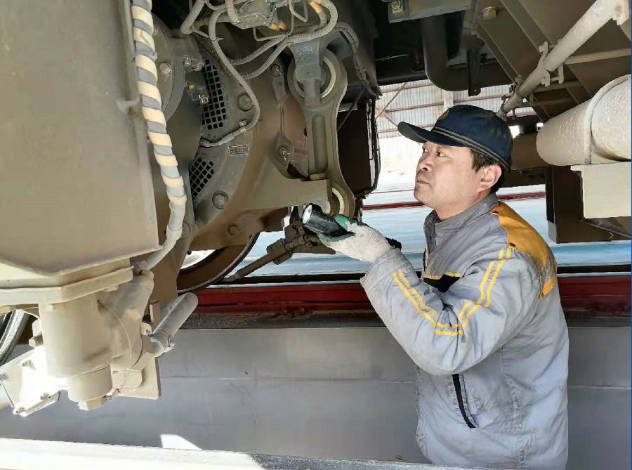 曾經(jīng)當(dāng)過(guò)多年火車(chē)司機(jī)的趙宇馳師傅,更深知機(jī)車(chē)狀態(tài)質(zhì)量良好的重要性。哪怕小小的一個(gè)螺絲釘?shù)乃蓜?dòng),都逃不過(guò)他的眼睛。只見(jiàn)他彎著腰,用手電筒對(duì)準(zhǔn)火車(chē)底部的每一個(gè)部位,敲敲打打,拉拉拽拽,一會(huì)擰擰螺絲,一會(huì)擦拭一下管線(xiàn),一絲不茍,沉著冷靜。