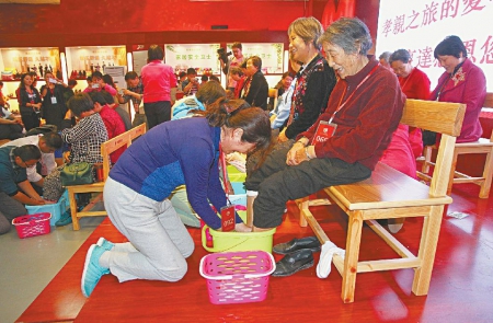 10月21日,參加重陽節感恩活動的市民給母親洗腳表達感恩之情。 當日,日照愛心志愿者、日照萬平口國際旅行社聯合舉辦“感恩父母”大型公益活動,活動現場子女為自己的父母洗起了腳,以此表達他們對自己父母和老年人的尊敬與感謝。(記者 曹鈺迪 攝)