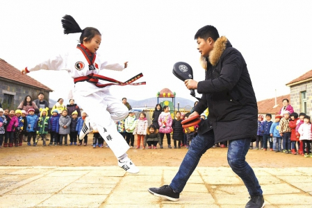 12月24日,新營小學四年級學生王佳瑜在為小朋友們表演跆拳道。當天,17名少年兒童在家長的陪伴下,來到50多公里外的莒縣龍山鎮潘家莊村幼兒園,給幼兒園的孩子們送來了學習用品、食品和玩具,并表演了精心編排的節目。 這些家長是通過微信朋友圈知道這些山區孩子的生活、學習和娛樂狀況的。他們利用周末在微信朋友圈里相約,購買了學習用品、食品和玩具,租了一輛大客車,帶著孩子冒著嚴寒來到這所山村幼兒園。城鄉孩子手拉手,讓這個冬季不再寒冷。 (記者 陳為峰 攝)