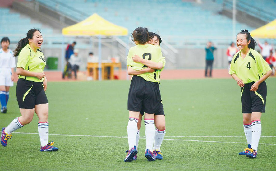 5月10日,日照職業技術學院體育場,嵐山一中女子足球隊的隊員進球后激動地擁抱祝賀。當天上午,嵐山一中女子足球隊1:0勝日照市海洋工程學院女子足球隊。 (記者 陳為峰 攝)