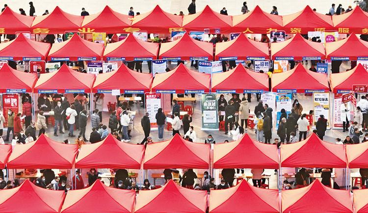 新春伊始,各地舉行人才招聘會,吸引眾多求職者前來應聘。圖為2023年2月1日,求職者在湖北襄陽人民廣場舉行的招聘會上了解崗位情況。 新華社發 謝勇/攝