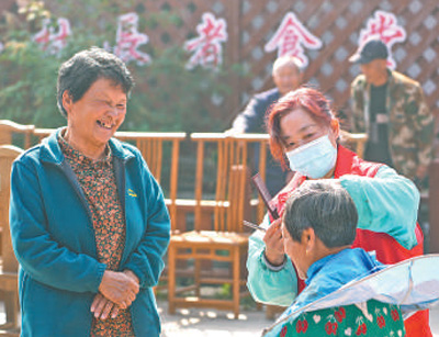 淄博市博山區池上鎮池埠村長者食堂里,志愿者在為老人理發。